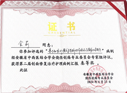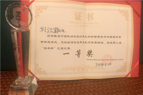 燒傷整形二病區(qū)副主任醫(yī)師劉江宏與來自全省各醫(yī)療單位的19位青年醫(yī)師激烈比拼,從評估、方案、處理等方面分享《再生醫(yī)療技術(shù)讓大學(xué)生獲得新生》,成功斬獲安徽省“榮祥杯”燒傷創(chuàng)瘍再生醫(yī)療病例大賽一等獎。